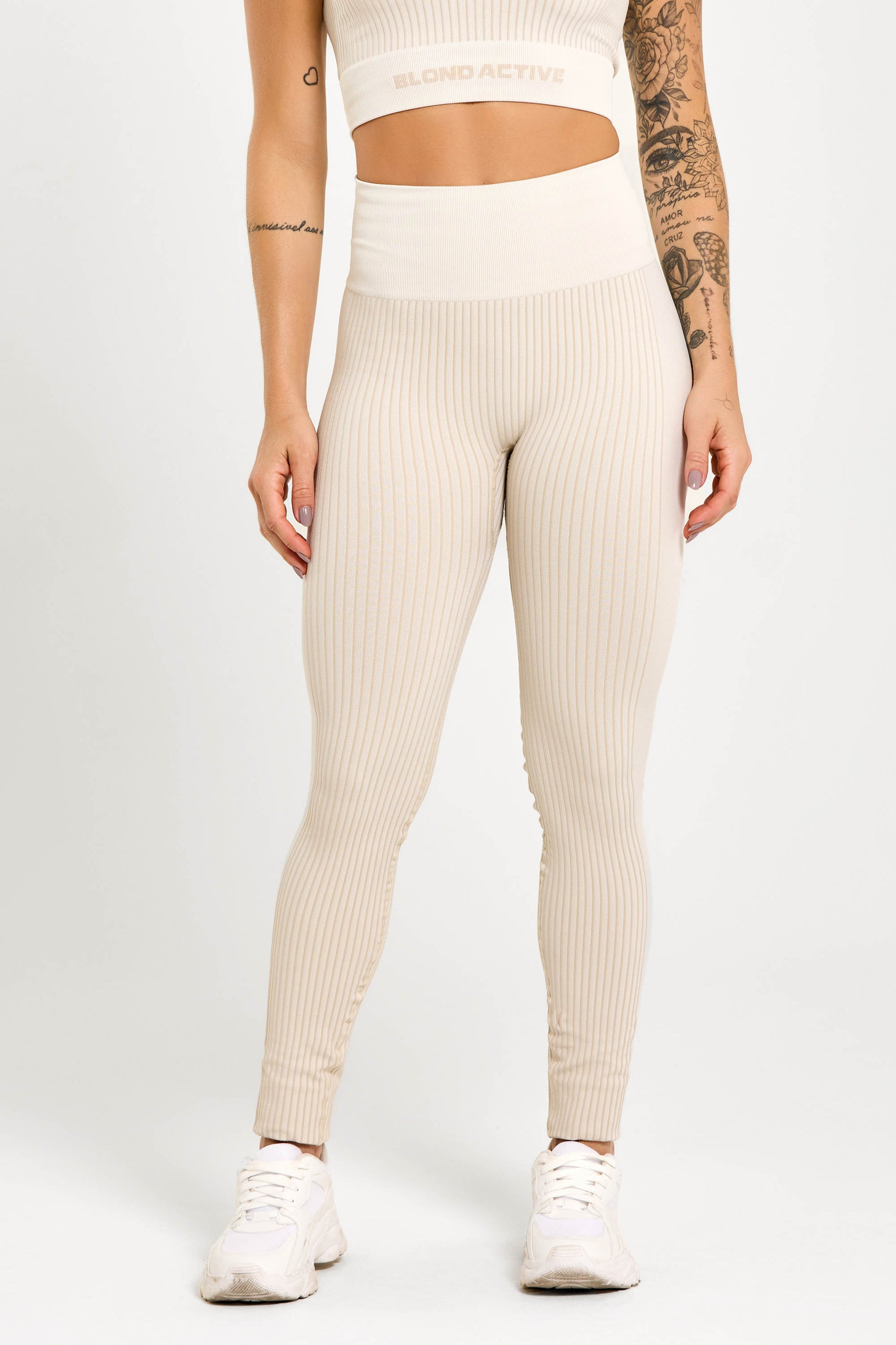 • Calça Legging Energy Lycra Seamless Tex Off White (canelada): cós alto anatômico que não enrola, compressão confortável e efeito segunda pele. A trama canelada agrega textura e ajuda na sensação de firmeza, sem marcar.