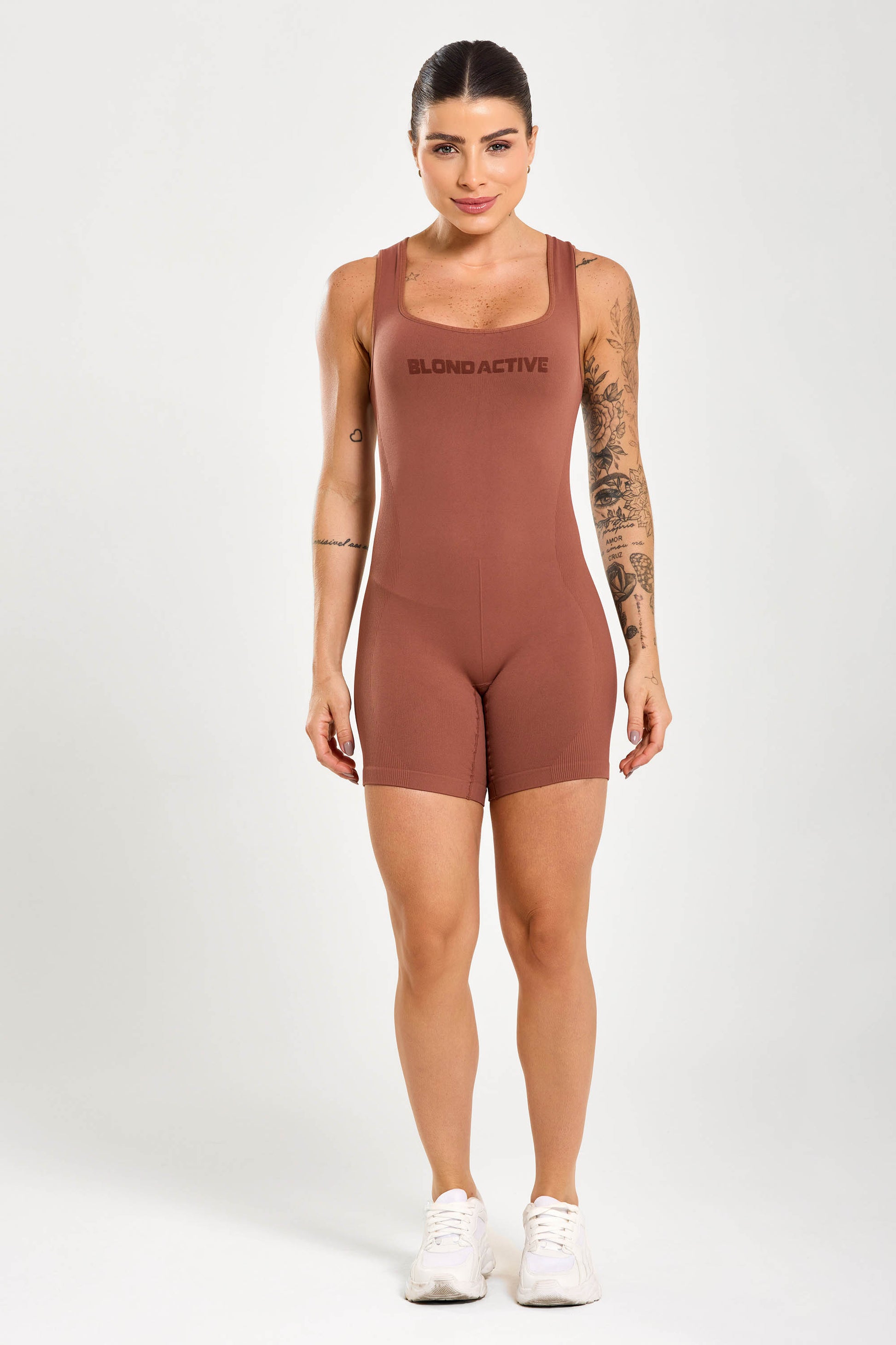 O Macaquinho Lycra Seamless Anatômico Coffe foi feito para treinos intensos e para o dia a dia. A construção sem costura reduz o atrito entre as pernas e o design não sobe durante o movimento. As listras anatômicas laterais têm alta aderência, “abraçam” o corpo e mantêm tudo no lugar, enquanto a lycra com elastano garante sensação de segunda pele, toque macio e liberdade total. Versátil, vai da academia para composições casuais com jaqueta, camisa ou blazer.