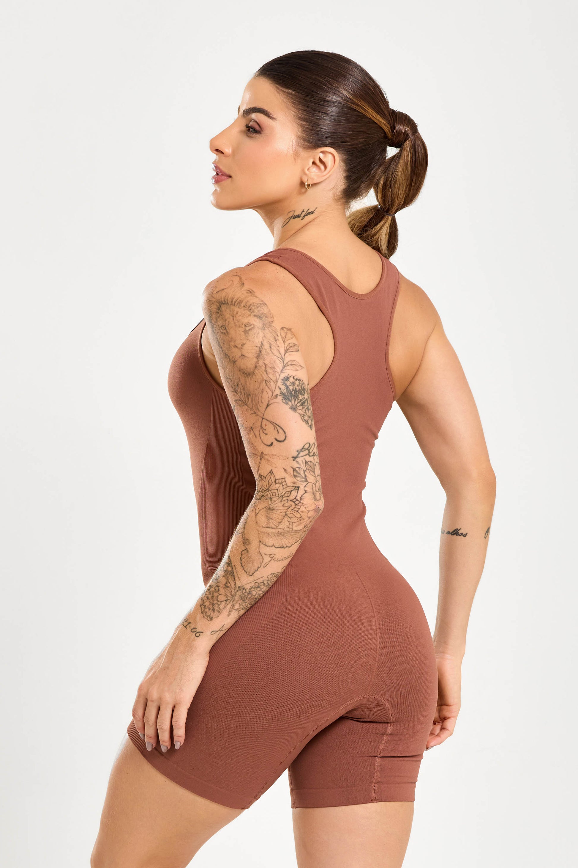 Macaquinho sem costura Coffe com compressão anatômica, listras laterais aderentes e ajuste que não sobe nem causa atrito entre as pernas.