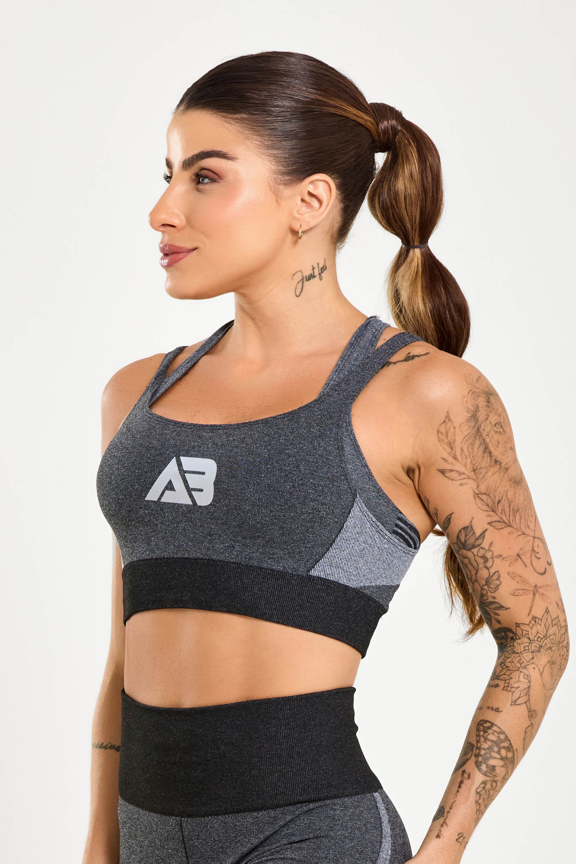 Top mescla com alças duplas, lycra seamless e proteção UV+. Suporte leve–médio, toque macio e ajuste anatômico.